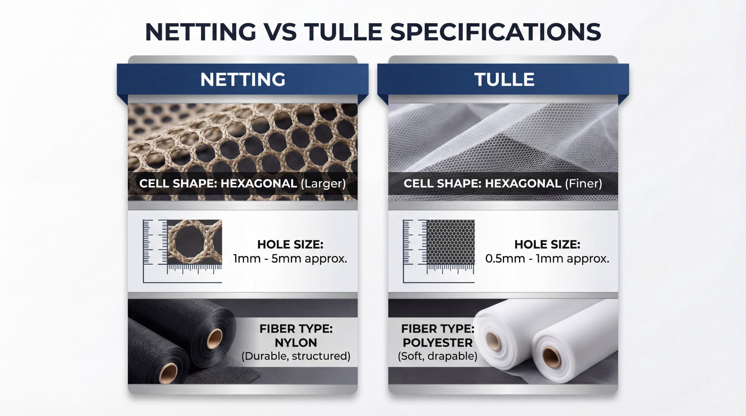 But wait, there’s more. While both fabrics typically feature a hexagonal “honeycomb” structure, the scale of these cells varies dramatically between the two types. Tulle cells are often nearly invisible to the naked eye, whereas netting cells are clearly defined.