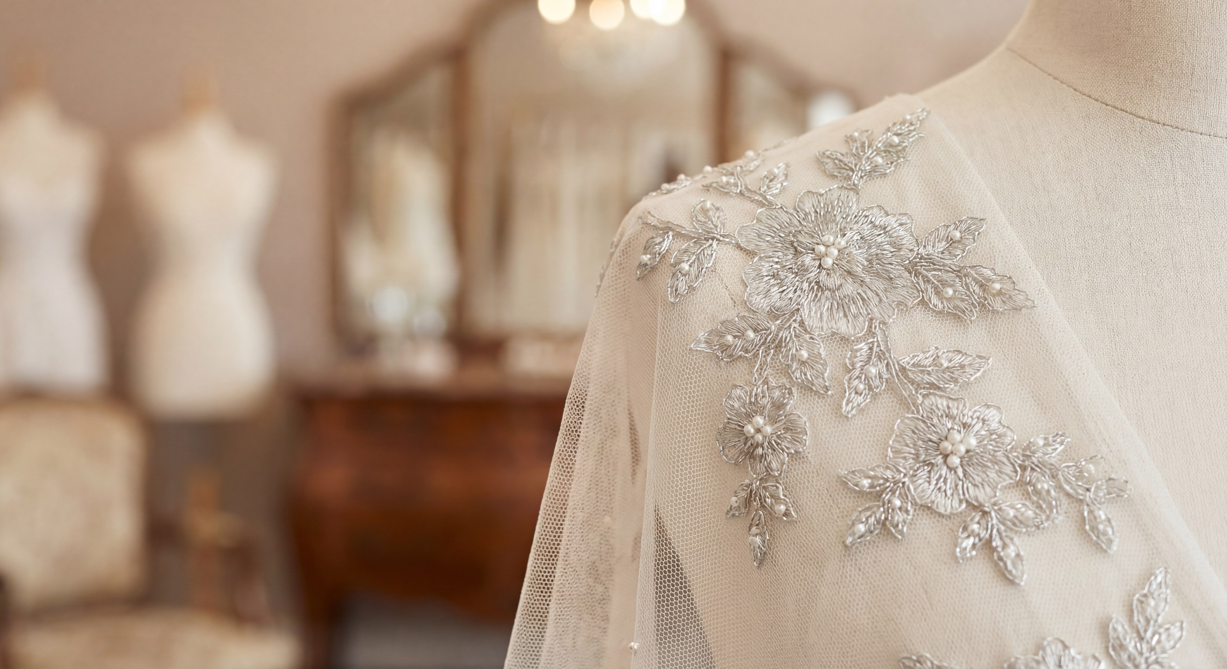 - Appliqué Base: Supporting heavy lace and pearl embellishments.