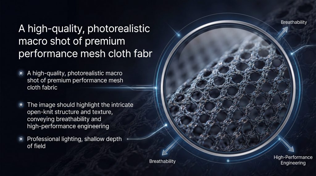 In high-performance garments, the mesh acts as a heat exchange system. It allows hot air to escape while moving moisture to the fabric’s surface where it can dry quickly.