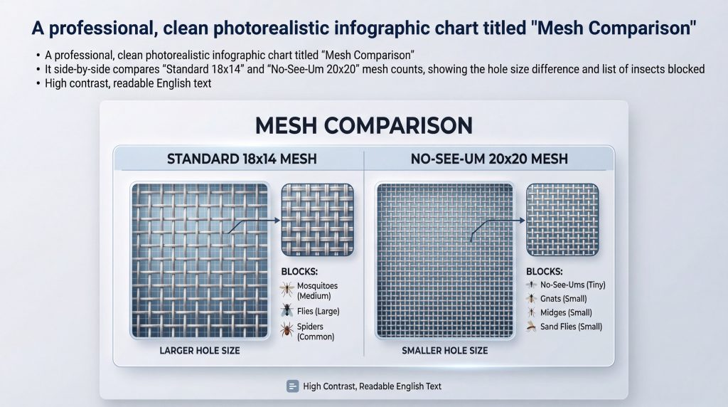 Key Takeaway: No-see-um mesh uses a higher thread count to create smaller apertures, effectively blocking microscopic biting insects that penetrate standard screens.