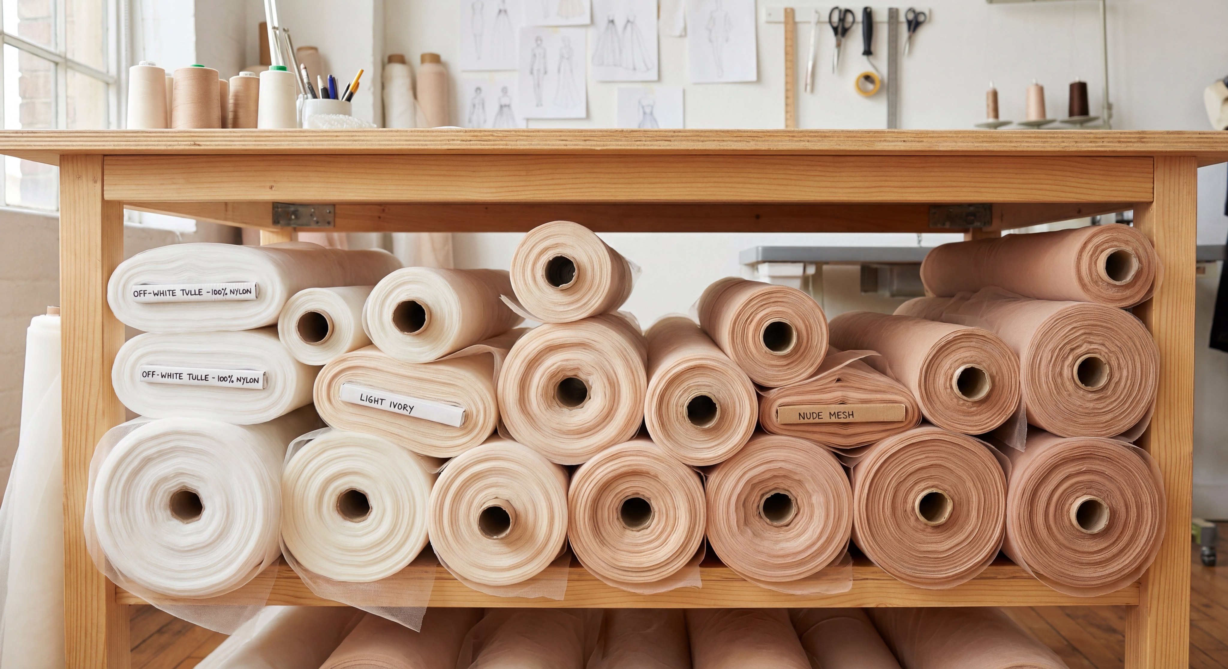 Standard widths for nylon tulle fabric are 54 inches, 72 inches, and 108 inches, with the widest option being the most popular for full-length cathedral veils. The width of the fabric determines how much it will “wrap” around your shoulders and the overall volume of the train.