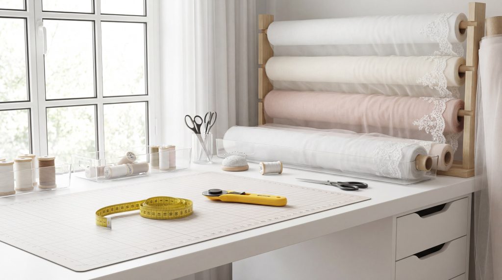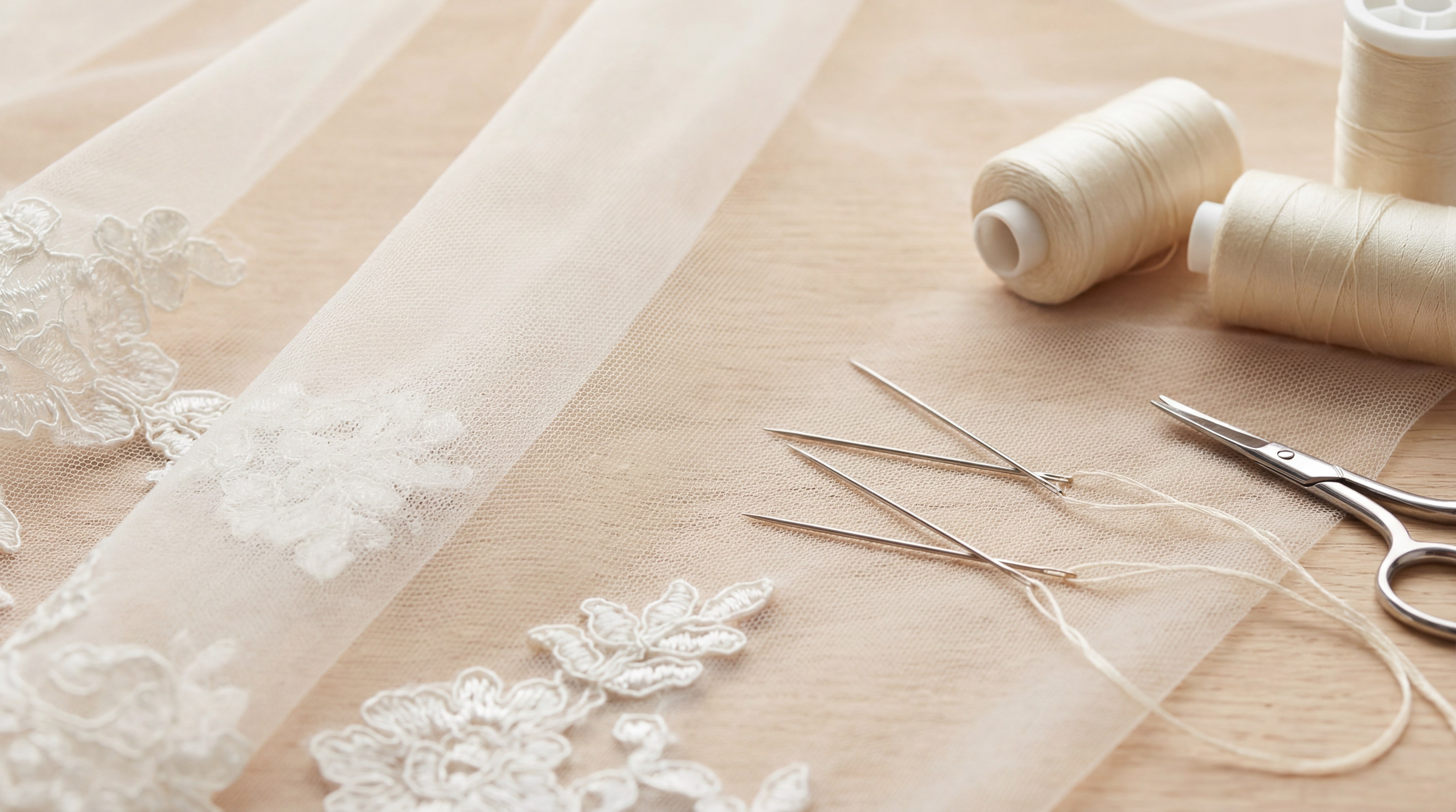 Using microtex needles and fine polyester thread ensures you don’t snag your bridal veil fabric during the assembly process. These tools are designed to glide through fine mesh without catching the delicate fibers.