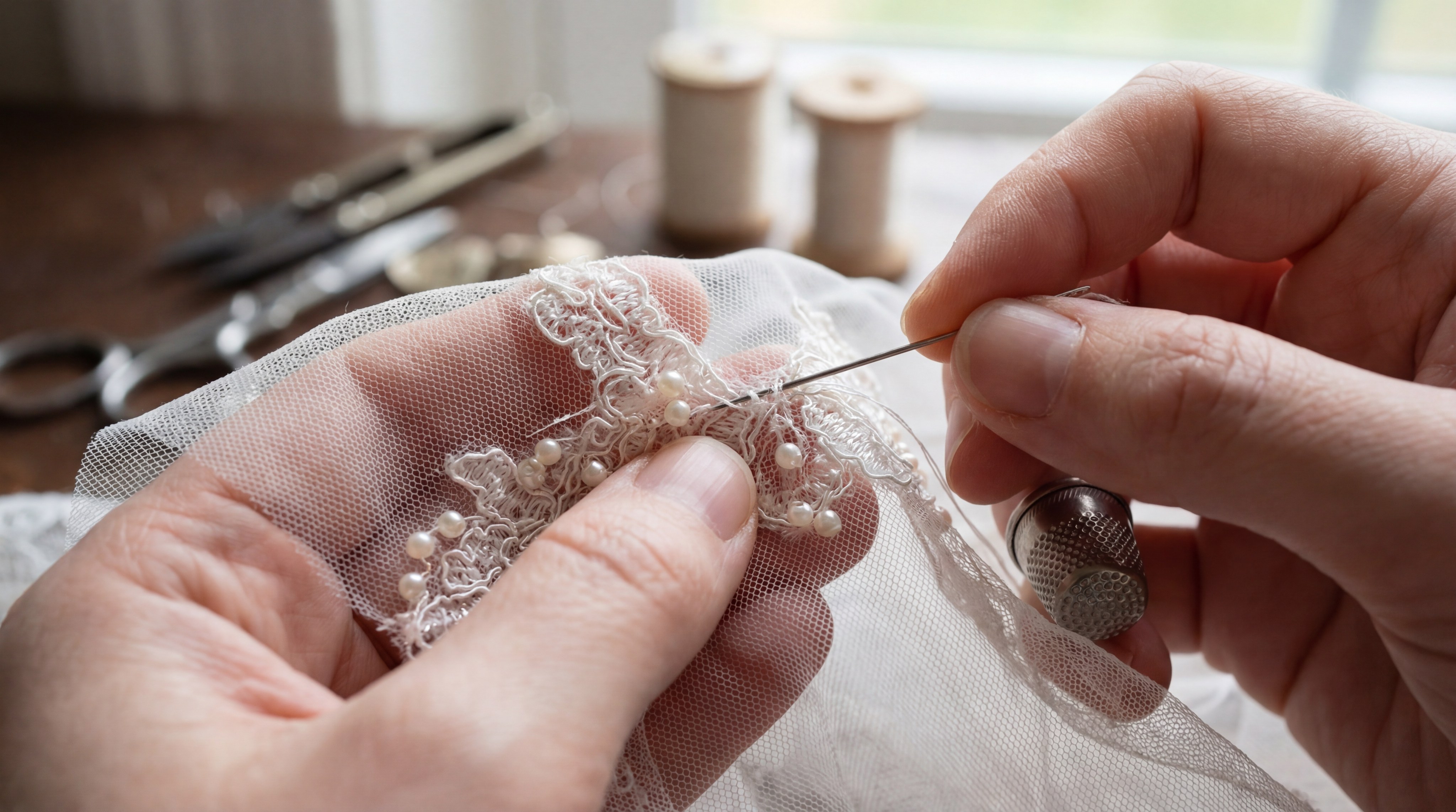 Hand-stitching is the most reliable method for attaching heavy ornaments or lace fabric to your bridal veil fabric without causing ripples. This allows you to control the tension and hide your knots within the lace pattern.