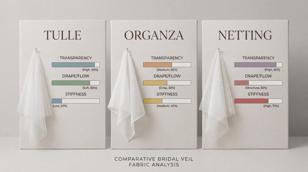 Key Takeaway: Choose English tulle for a romantic flow, silk for ultimate luxury, or Italian mesh for a modern, high-clarity appearance.