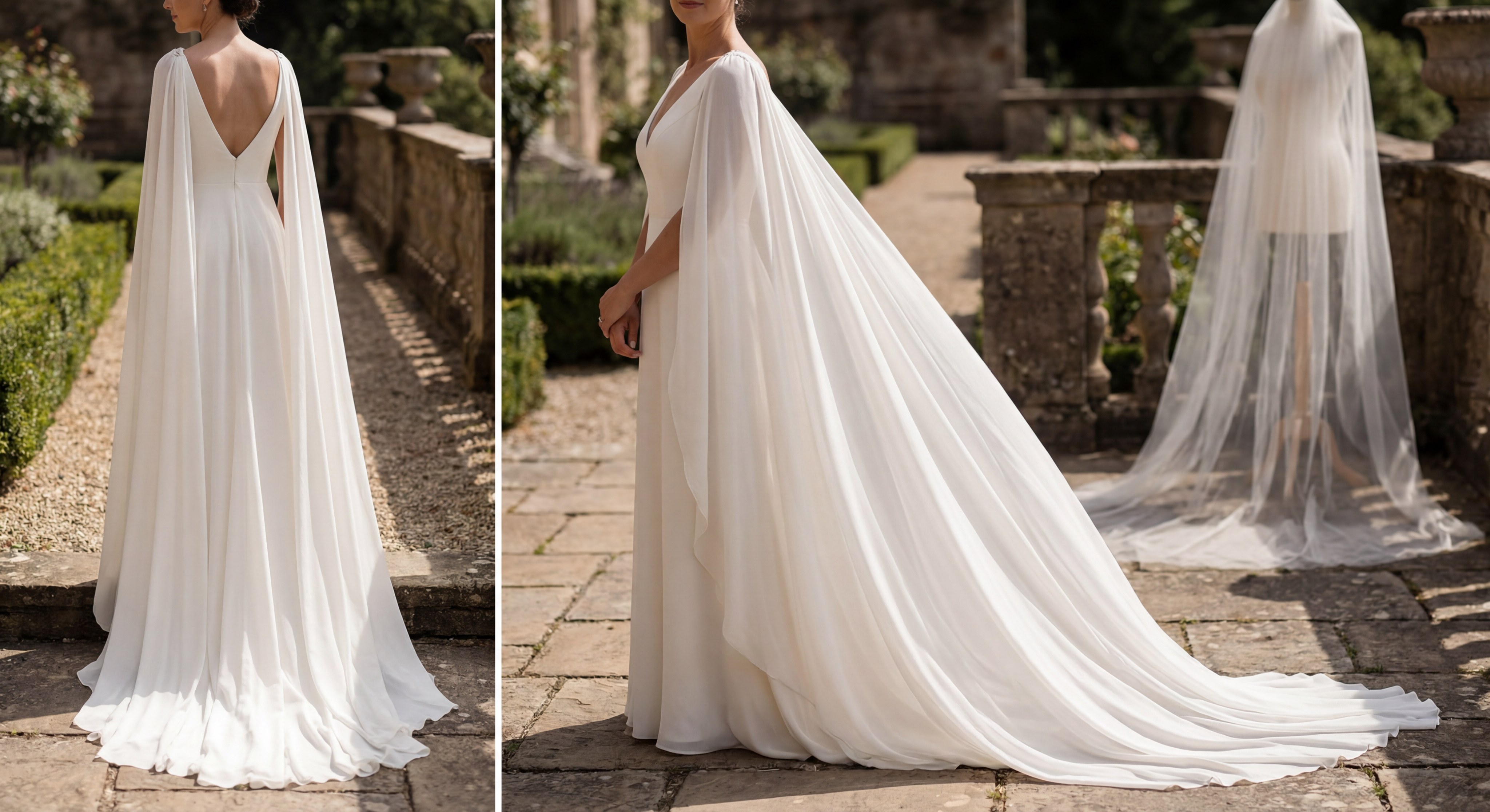 Chiffon is an excellent choice for brides seeking a non-traditional, opaque look that offers a dramatic, sweeping drape. This bridal veil fabric is frequently used for “cape veils” or bohemian styles where the material flows from the shoulders rather than the head. It is entirely matte and has a much tighter weave than tulle, meaning it is not transparent. Chiffon creates a beautiful “waterfall” effect as you walk down the aisle.