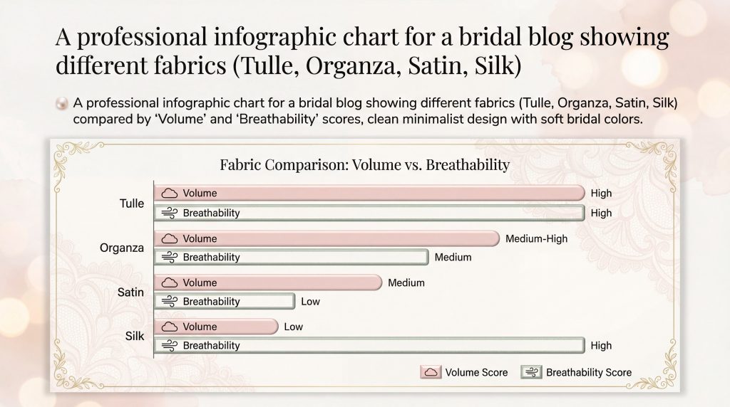 - Opacity: Prevents the dress from being “see-through” under bright ceremony lights or camera flashes.