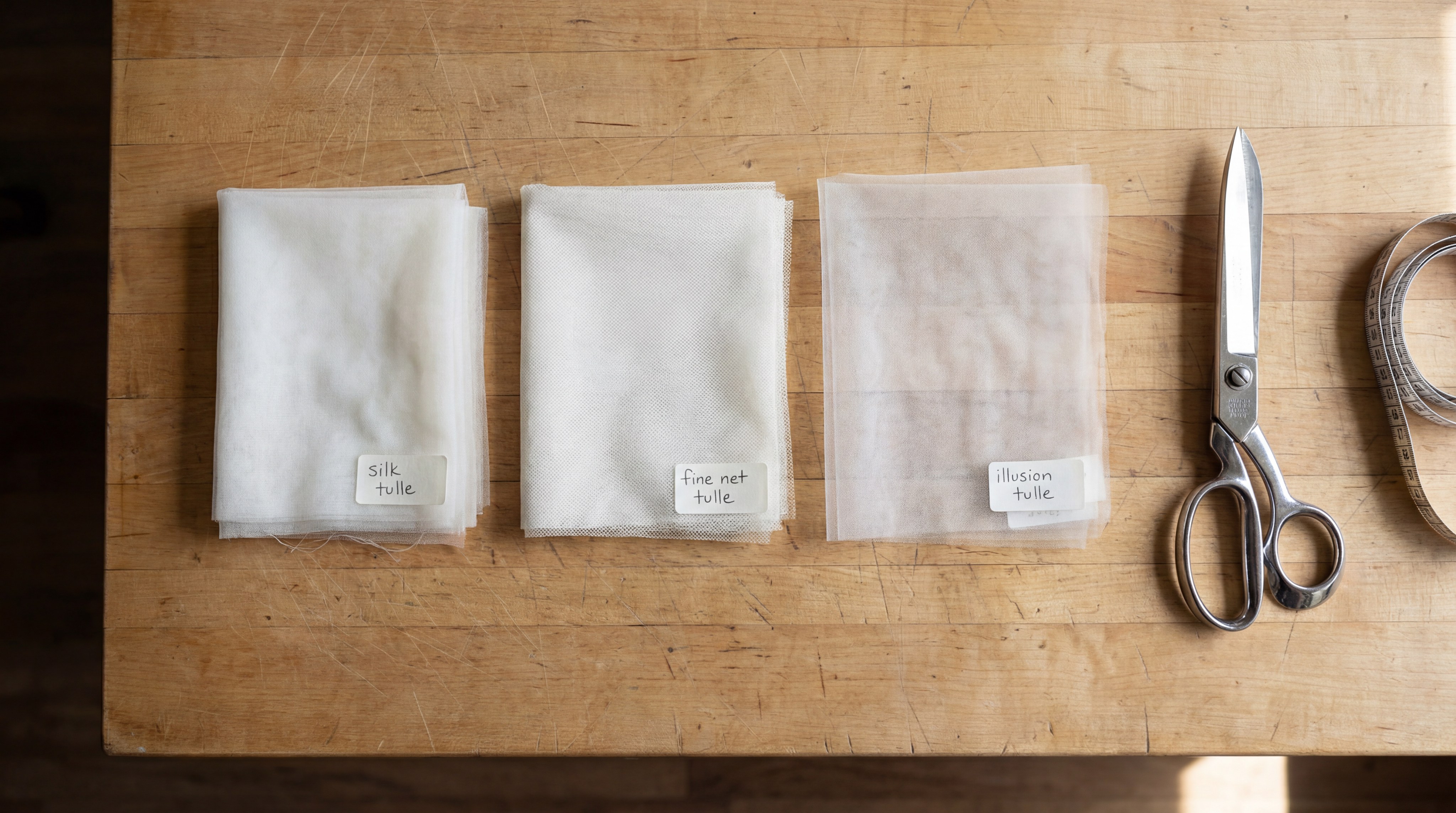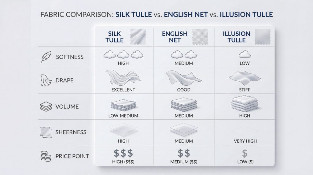 Direct Answer: The primary differences lie in three pillars: Material (Silk vs. Nylon), Drape (Fluid vs. Structured), and Sheerness (Opaque vs. Transparent). Silk tulle fabric is the softest and most fluid; Illusion is the sheerest and stiffest; English net is the heaviest and most durable.