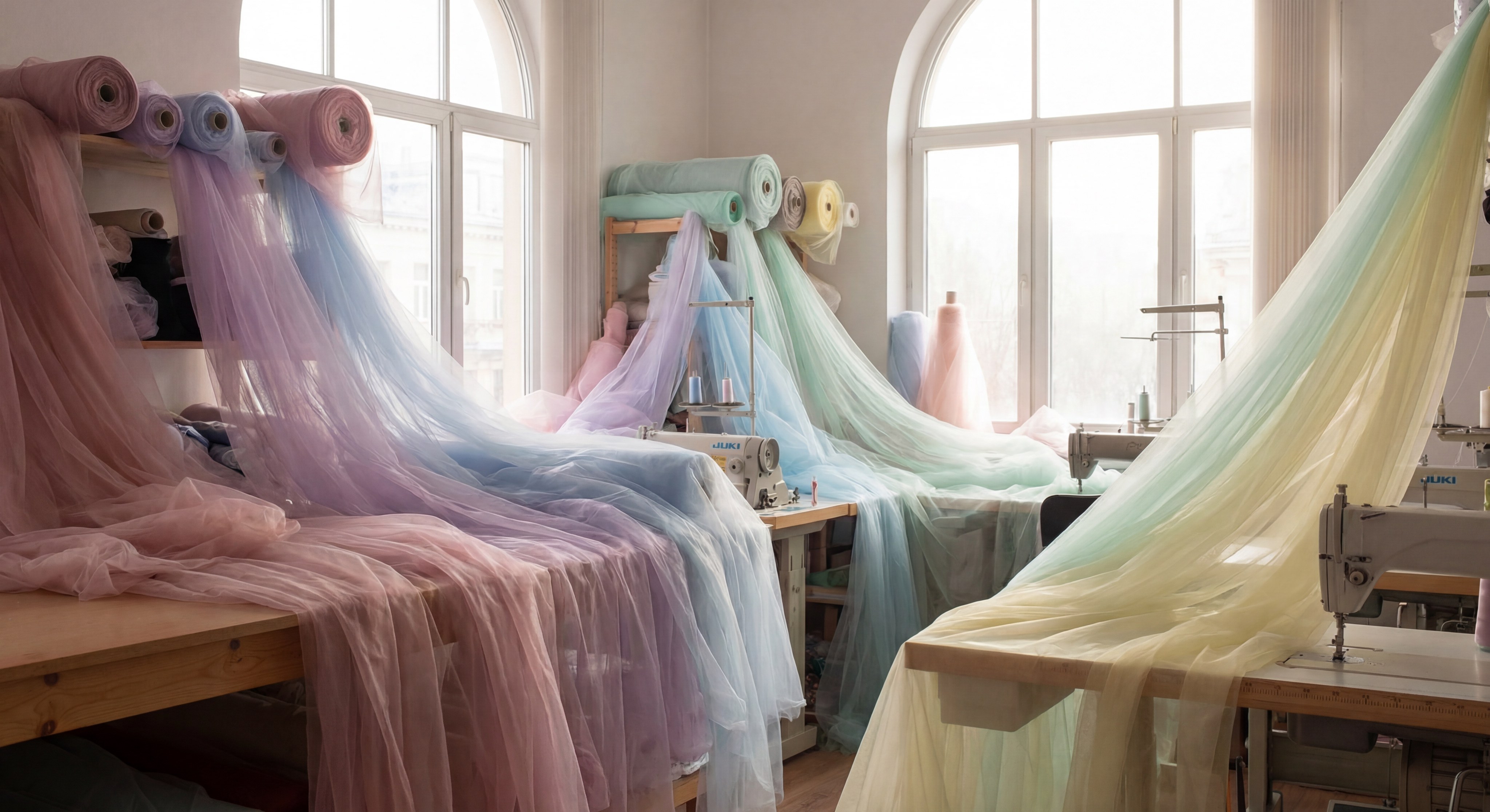 High-quality tulle is best sourced directly from specialized manufacturers who utilize advanced warp-knitting technology like KARL MAYER machines. These professional facilities maintain strict climate controls to ensure the synthetic fibers do not become brittle or static-heavy during production. When evaluating what is tulle fabric made of, professional buyers look for fiber purity and dye consistency across large batches. A controlled studio environment ensures that the pastel shades you order today will match your production run six months from now.