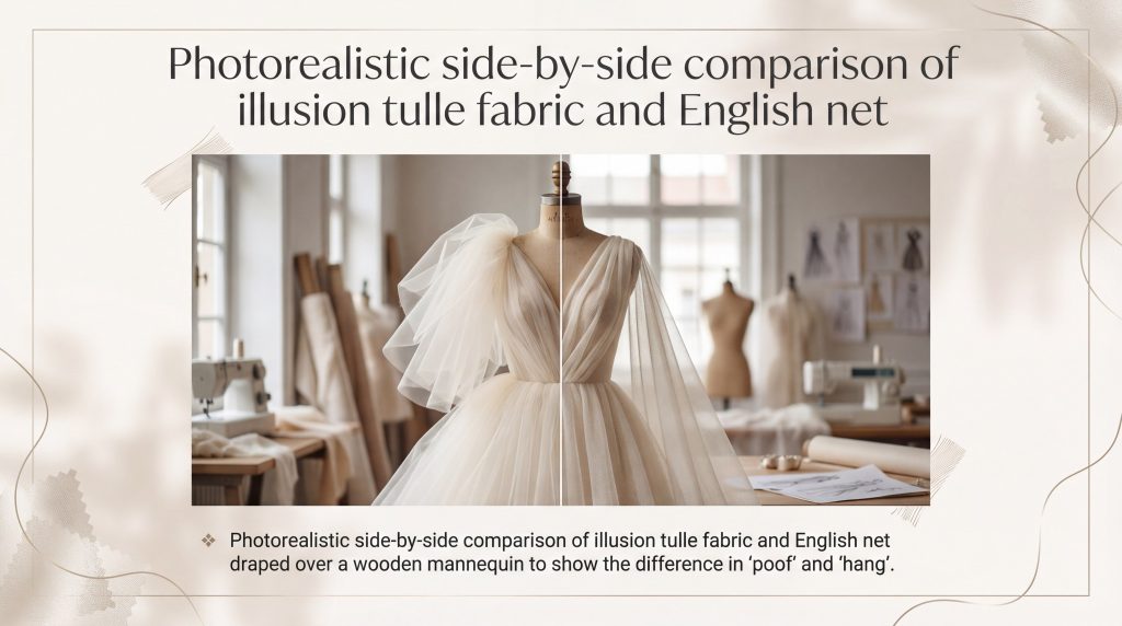 Key Takeaway: Choose tulle for volume and maximum transparency; select English net for a soft, vintage-inspired drape that mimics expensive silk.