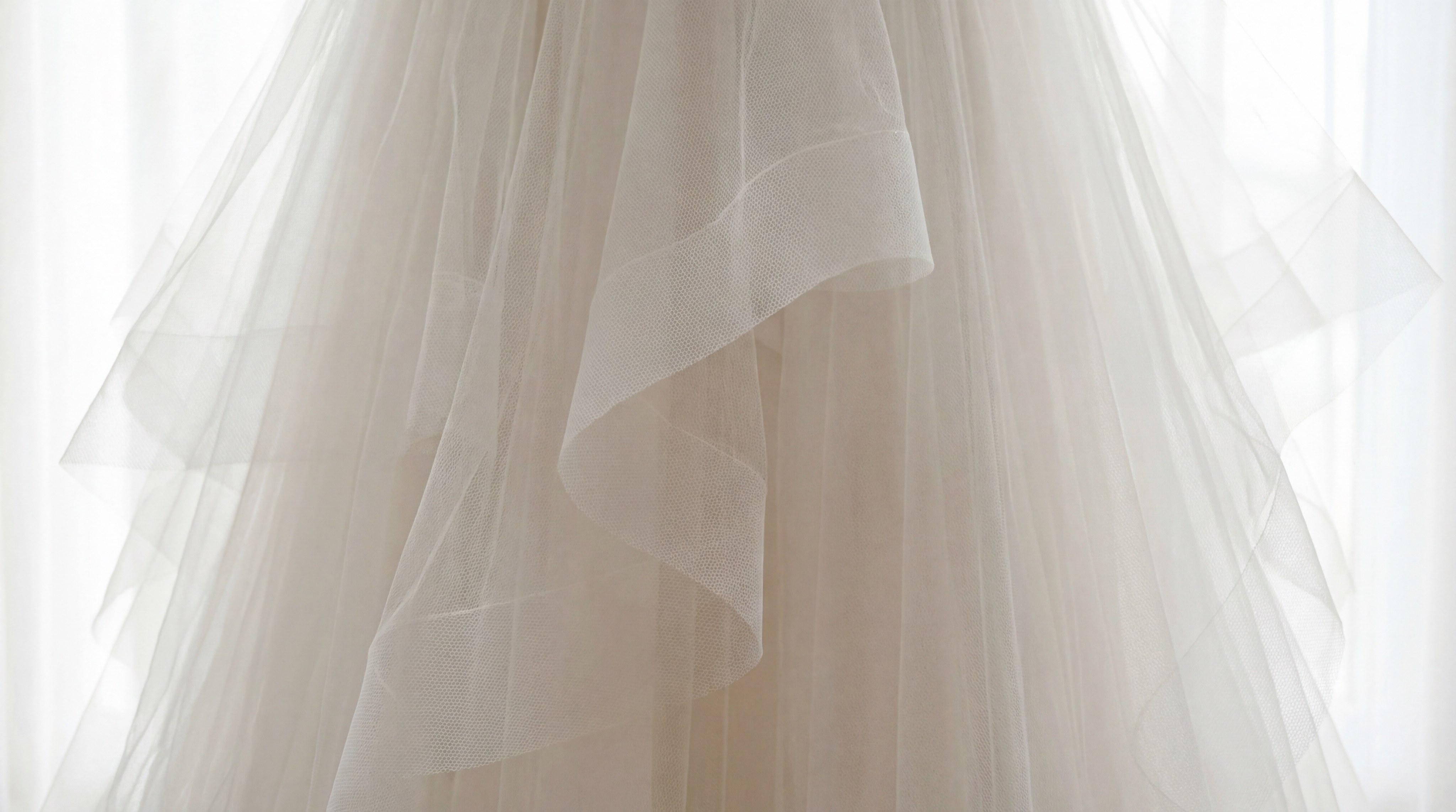 Tulle is a very fine, lightweight mesh that is often starched to provide volume and structure for gowns. It is synonymous with luxury and ceremony due to its misty, ethereal appearance.