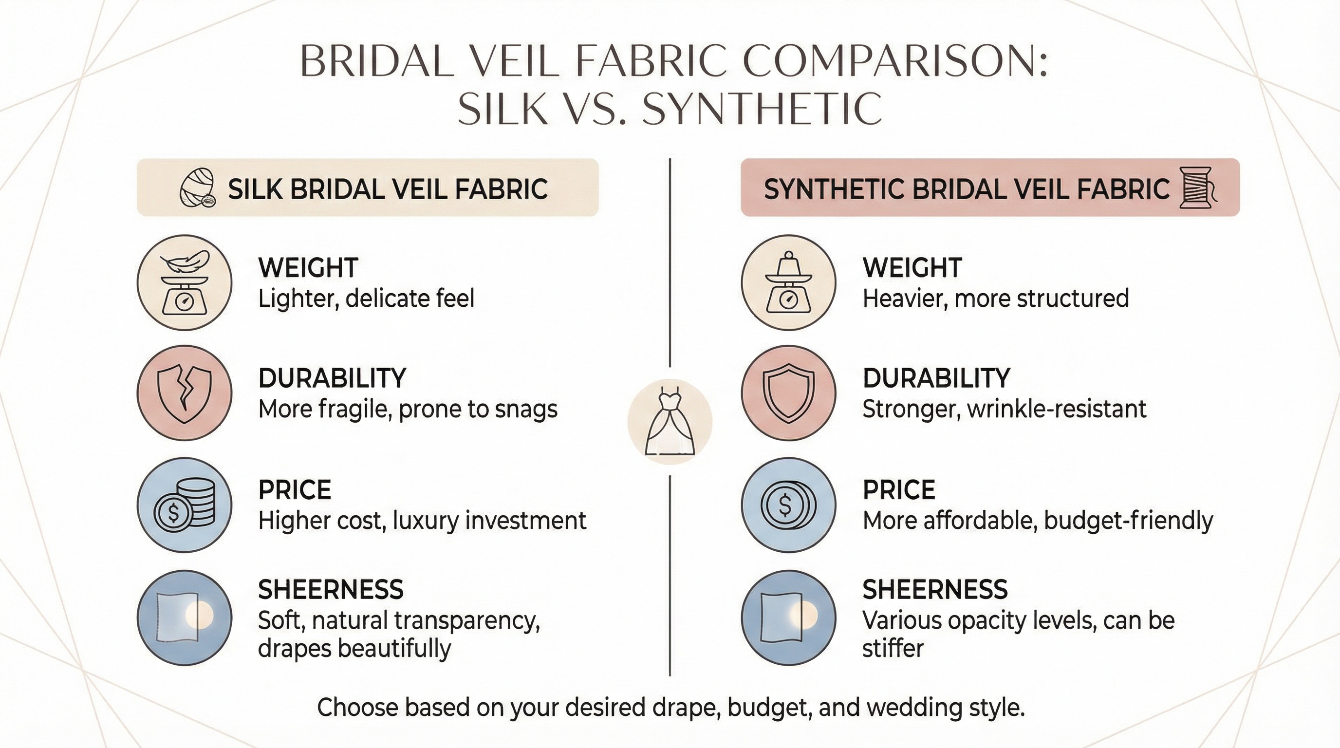 Key Takeaway: Synthetic materials offer better durability and price points for most brides compared to delicate silk options.