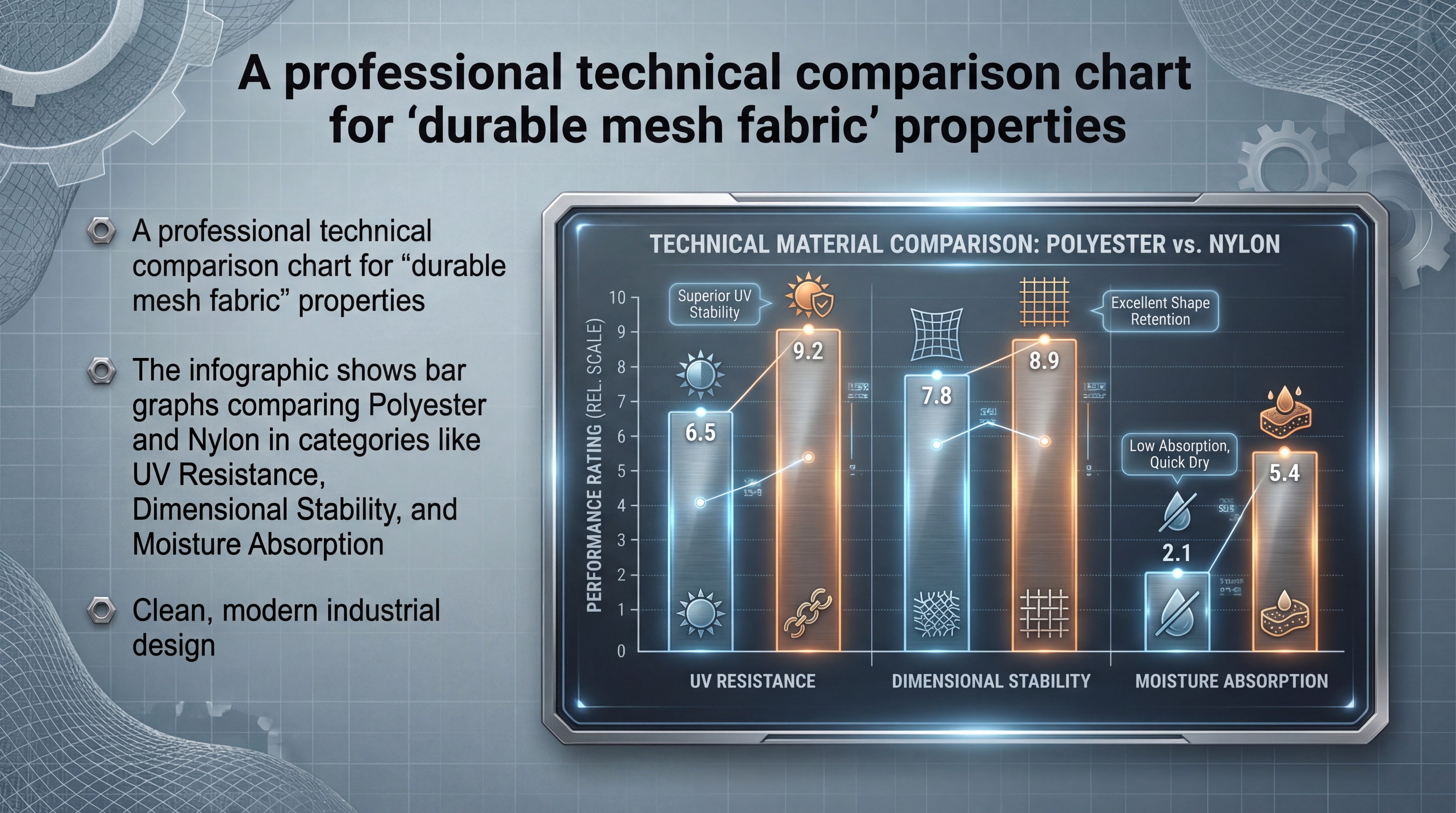 Solution: High-tenacity durable mesh fabric engineered from nylon and polyester provides the ultimate rugged solution. These materials feature a warp-knit structure designed for dimensional stability and specialized resistance to chemicals and weather.