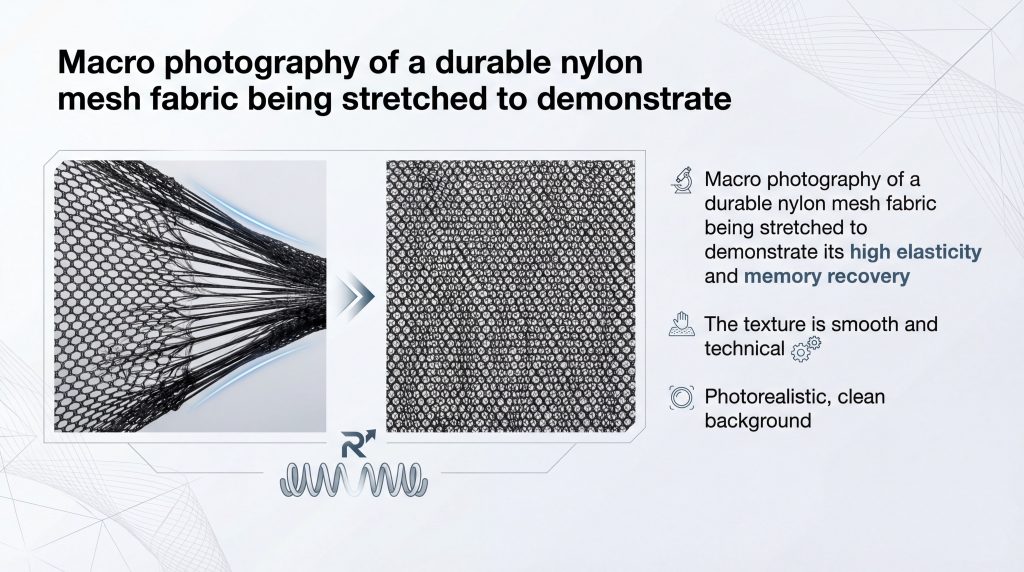 Nylon is a polyamide known for its remarkable ability to stretch and return to its original form. This makes it the premier durable mesh fabric choice for applications requiring high flexibility and memory.