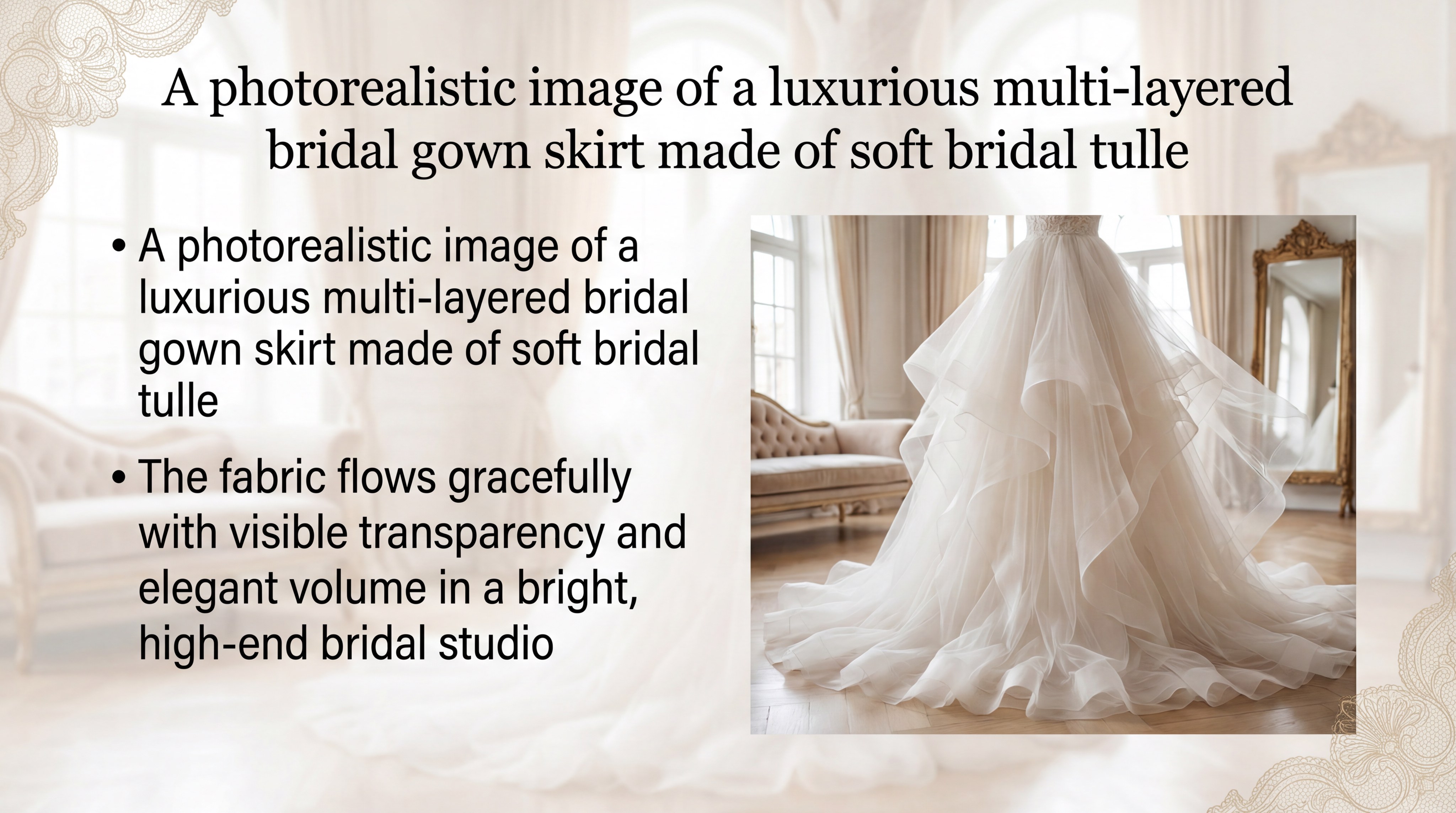 | Gown Volumizing | Medium-Stiff Tulle | Holds shape under heavy lace | |