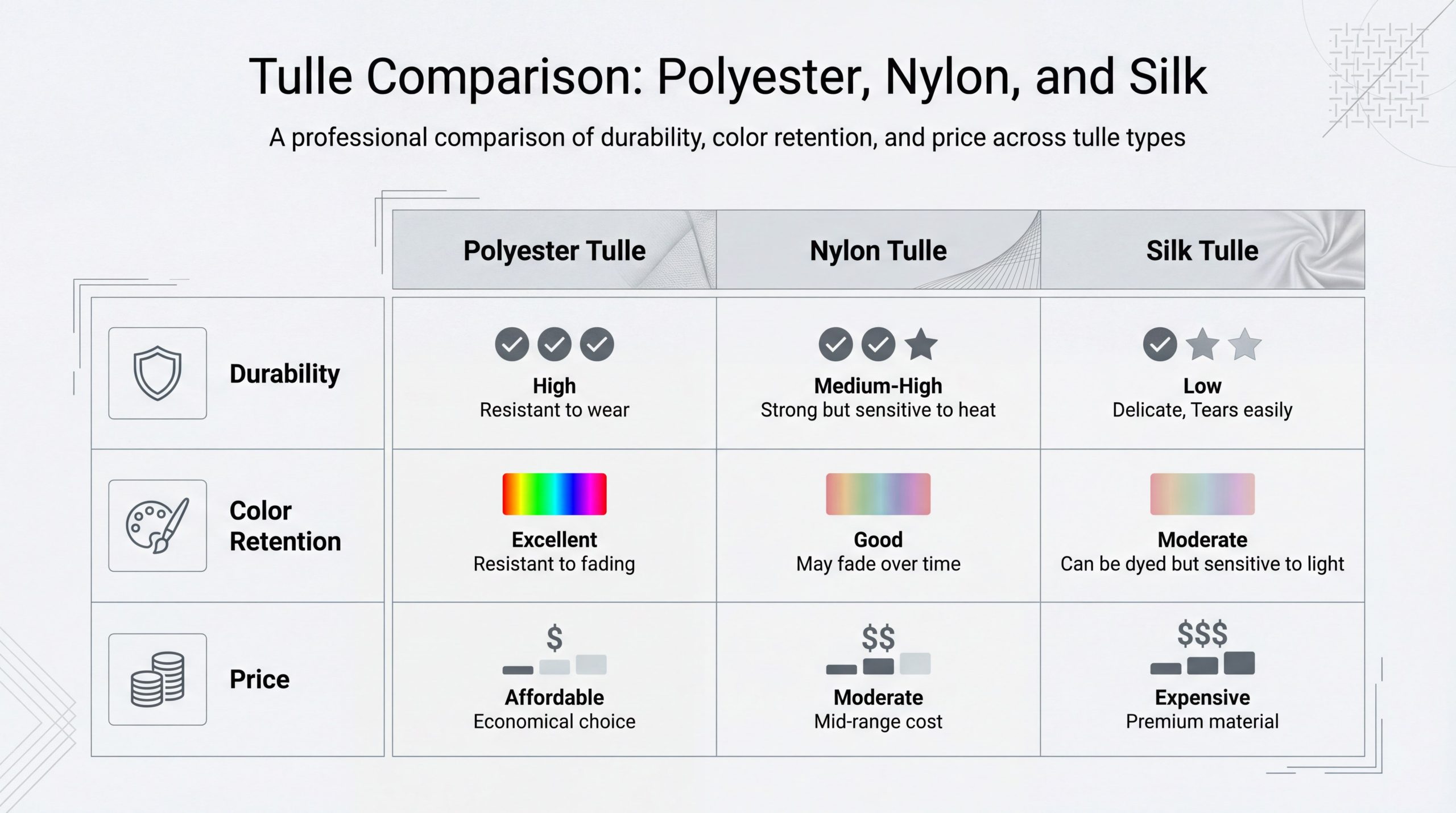 Key TakeawayPolyester variants maintain the historical aesthetic of traditional tulle while offering the durability required for modern manufacturing.