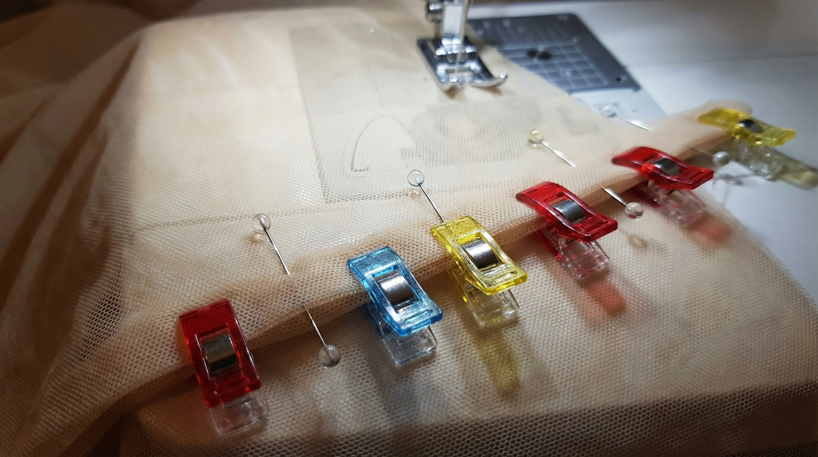 Sewing clips are often superior to pins when working with multiple layers of mesh. They provide a firm grip without the risk of the fabric “sliding” off the pin shaft.