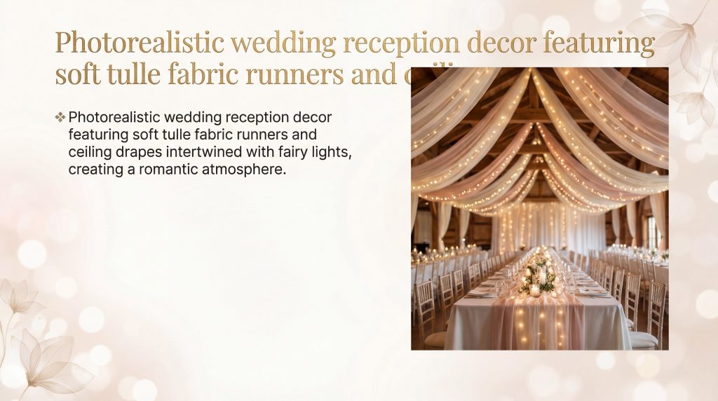 Integrating lighting with your fabric drapes creates a magical glow that transforms the entire reception space. The fine mesh of the fabric acts as a filter, hiding the wires of the lights while allowing the tiny bulbs to twinkle like stars through the layers.