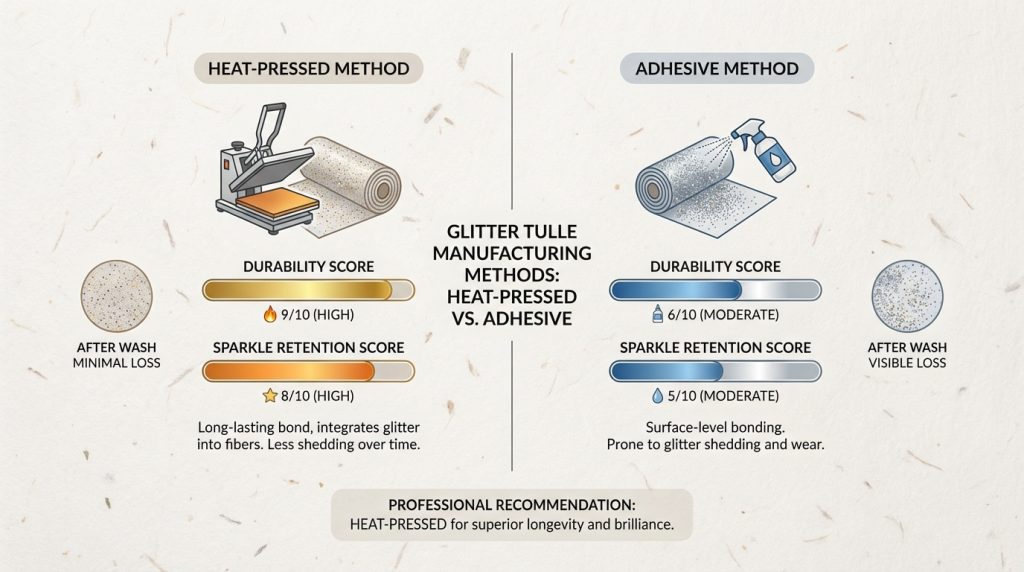 Sourcing glitter tulle fabric at a B2B level requires identifying suppliers who utilize heat-pressed bonding for superior durability. Quality control is paramount when purchasing in bulk to ensure consistency across bolts.
