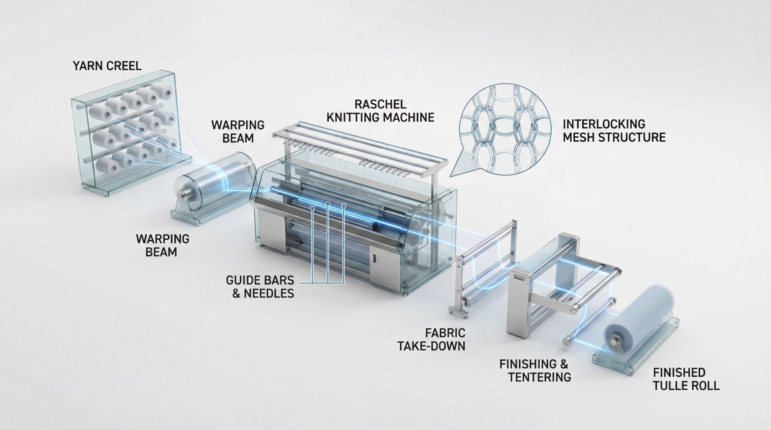 To understand what is tulle fabric made of , you must examine the warp-knitting process. Most modern tulle is produced on Raschel machines, which use thousands of needles to loop yarns together simultaneously. This is a far cry from the single-thread bobbin methods of the past.