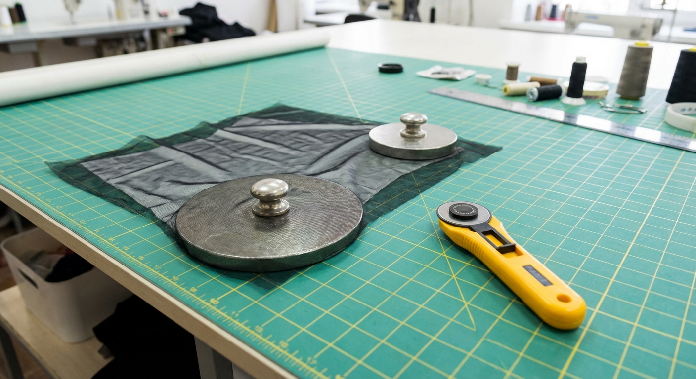 Key Takeaway: Use a rotary cutter and weights on a flat surface to maintain the fabric’s geometric integrity during cutting.