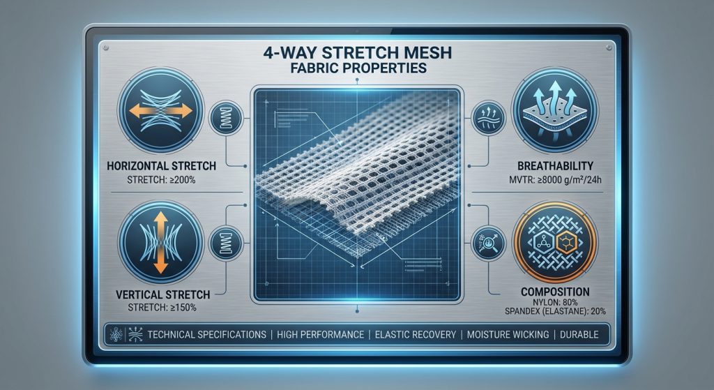 Key Takeaway: The defining characteristic of this mesh is its ability to expand and recover in all directions, making it essential for form-fitting apparel.